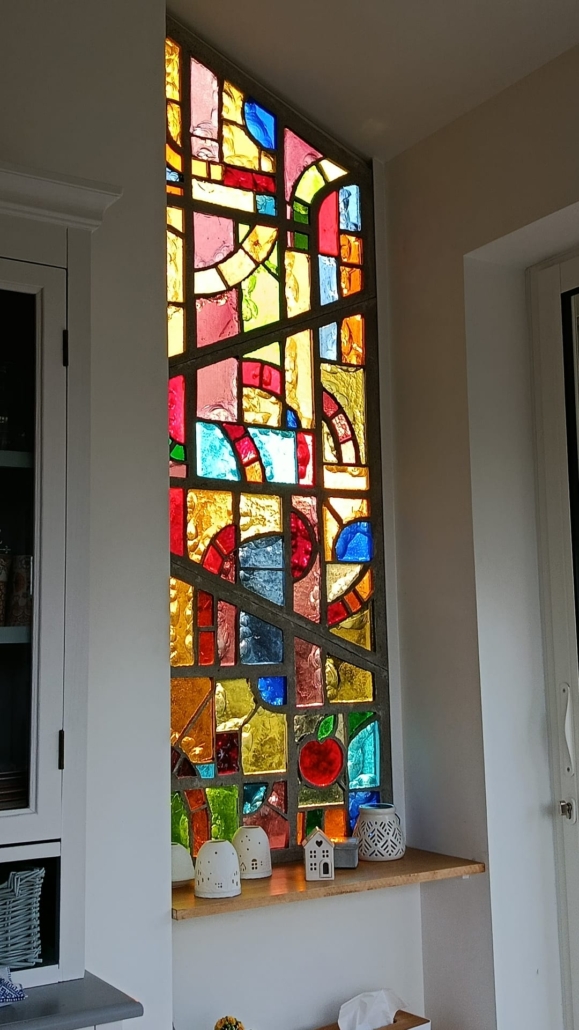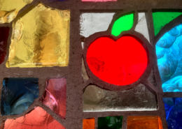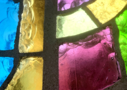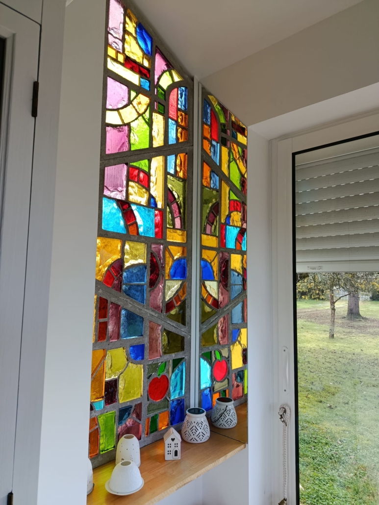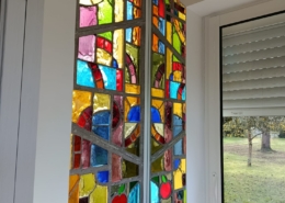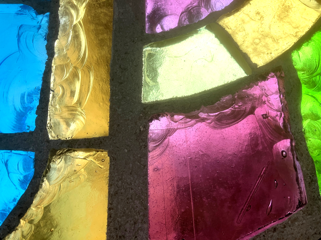 Un vitrail plutôt joyeux, qui assume pleinement ses couleurs vives et ses contrastes tranchés. Les lignes sont franches et l’écaillage met en valeur la nature charnelle du verre de couleur massif.