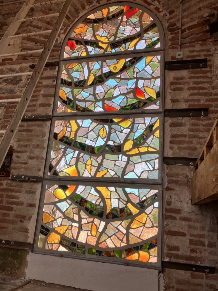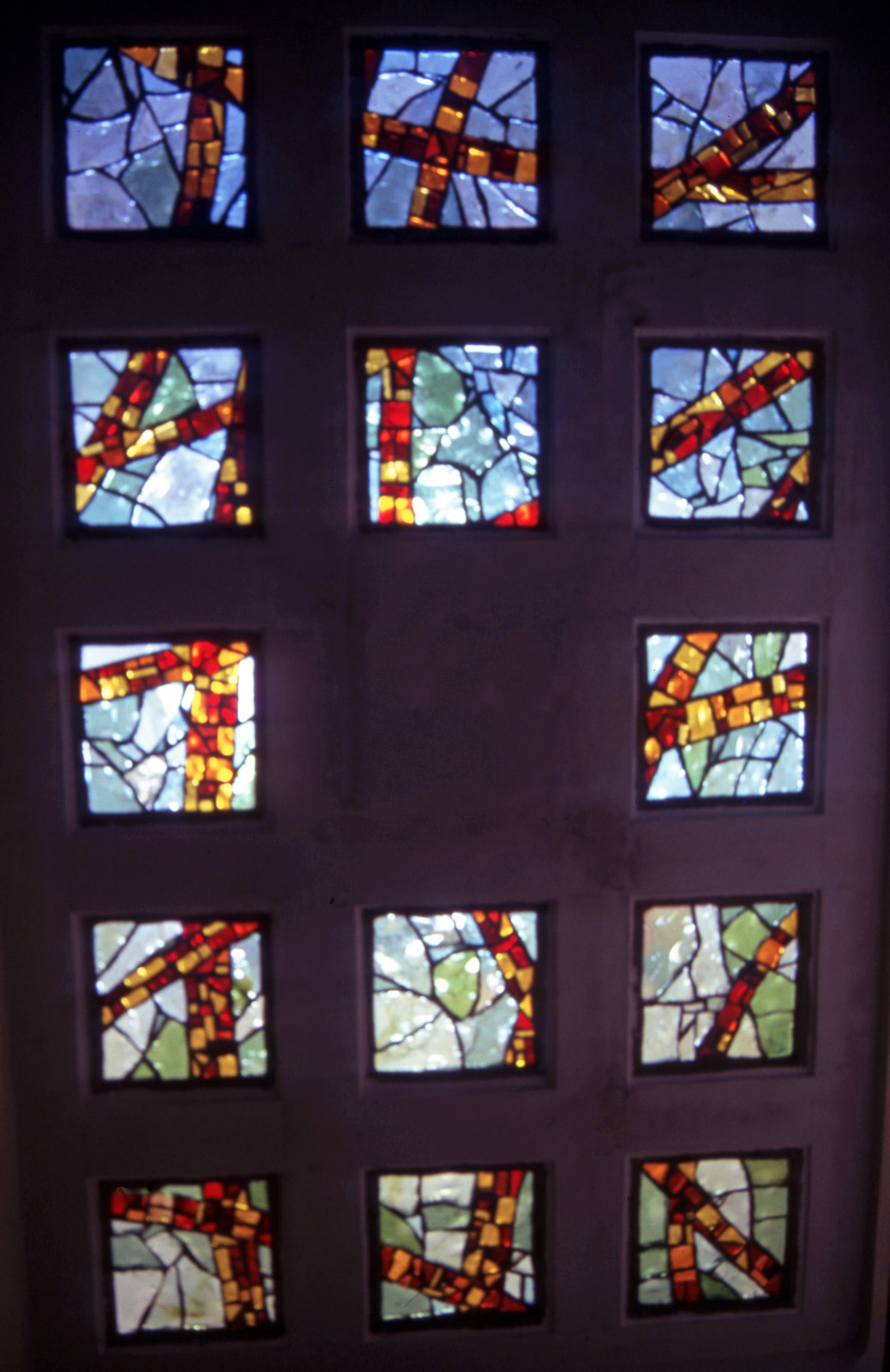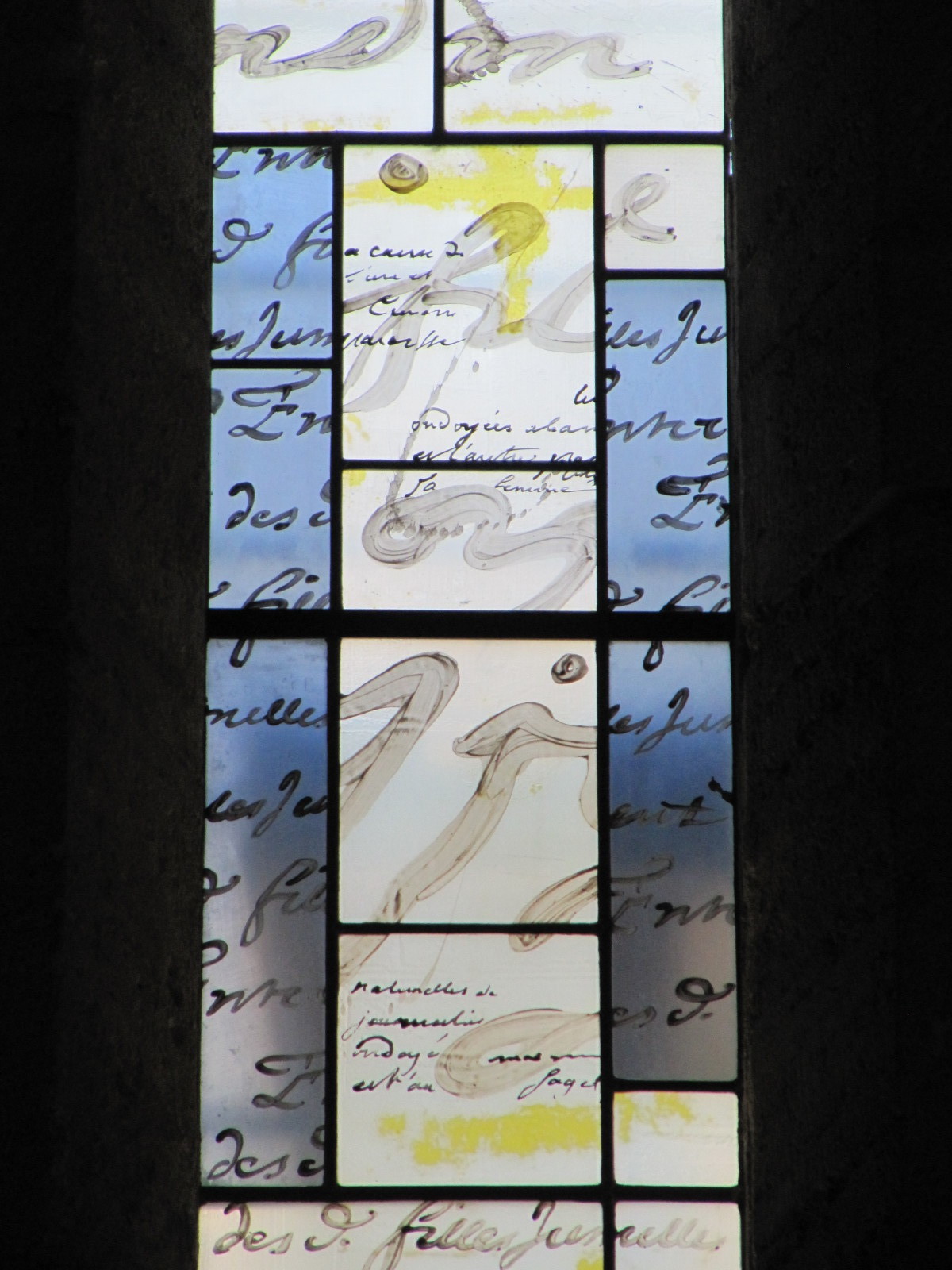 Une église toute neuve, ce n’est pas si fréquent. J’ai réalisé le 78 baies de cet édifice peu banal en réalisant des bas-reliefs de verre gestuels et lumineux : grands aplats de verre float graffité à la grisaille mousseline, fusionnés sur moules éphémères et rehaussés de peintures au jaune d’argent.